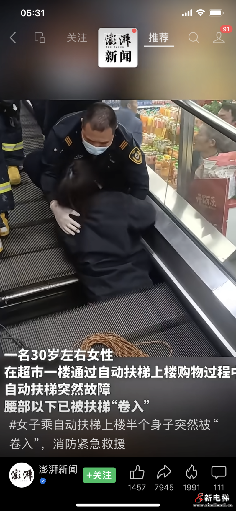事发上海奉贤,一超市扶梯梯级塌陷,将一女乘客的腰部卡住