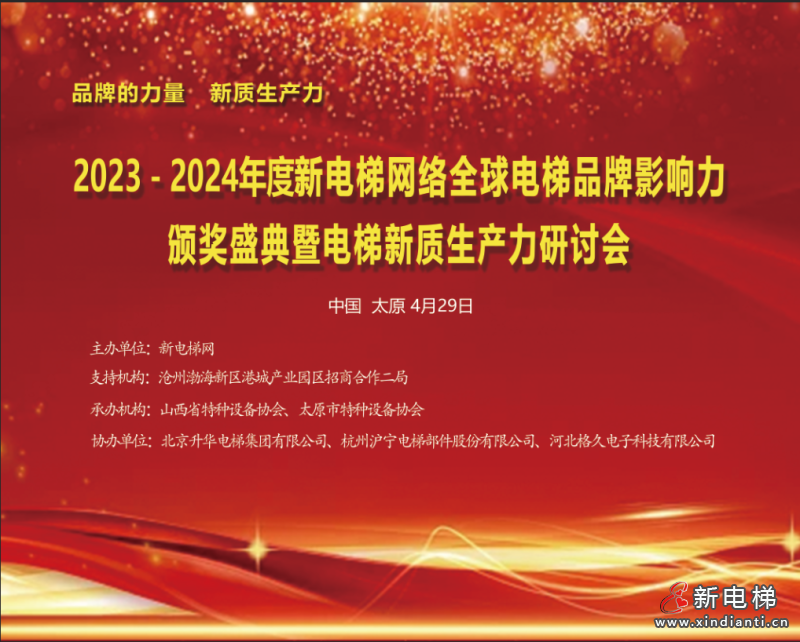 4月29日,品牌的力量,新质生产,2023-2024年度新电梯网络全球电梯品牌影响力颁奖盛典暨电梯新质生产力研讨会在太原举办。