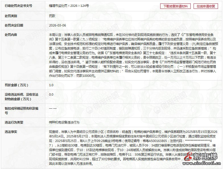 2026年3月6日,广州市增城区市场监督管理局对通力电梯有限公司广州分公司作出行政处罚,罚款1万元,事由为该公司在电梯困人事件中未按规定时限抵达现场救援。